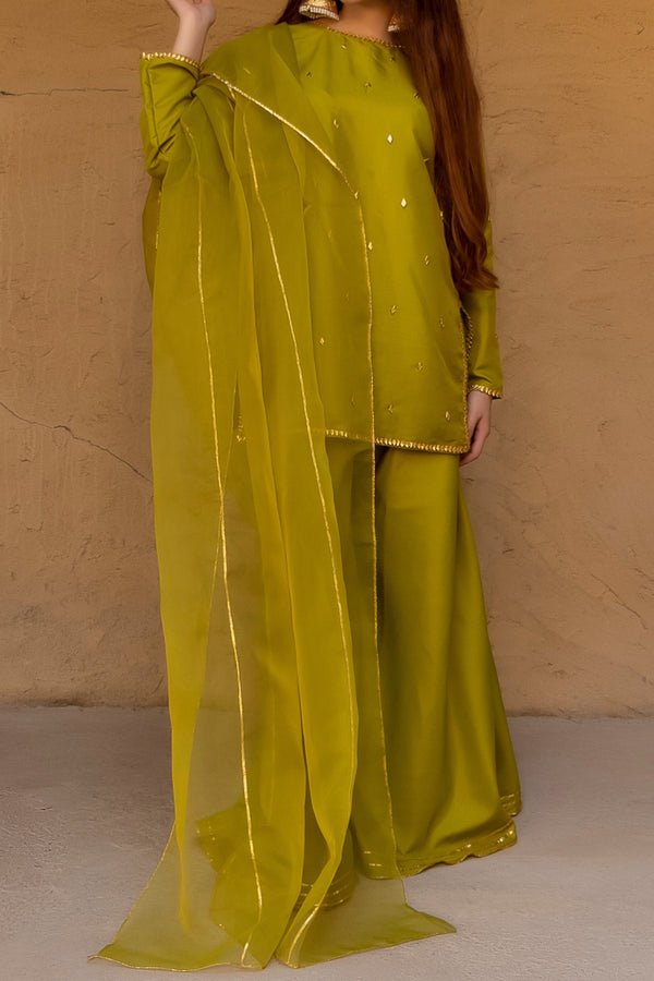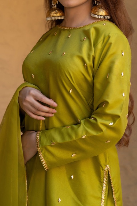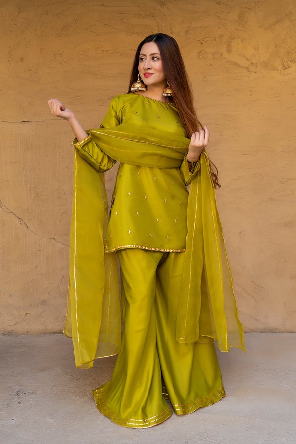 This olive green colour Katan shatan base sharara set is designed with hand work gotta embellishments all over the edges finishing & single patti spray all over the shirt , with sunerhi paisley patti on the sleeves.